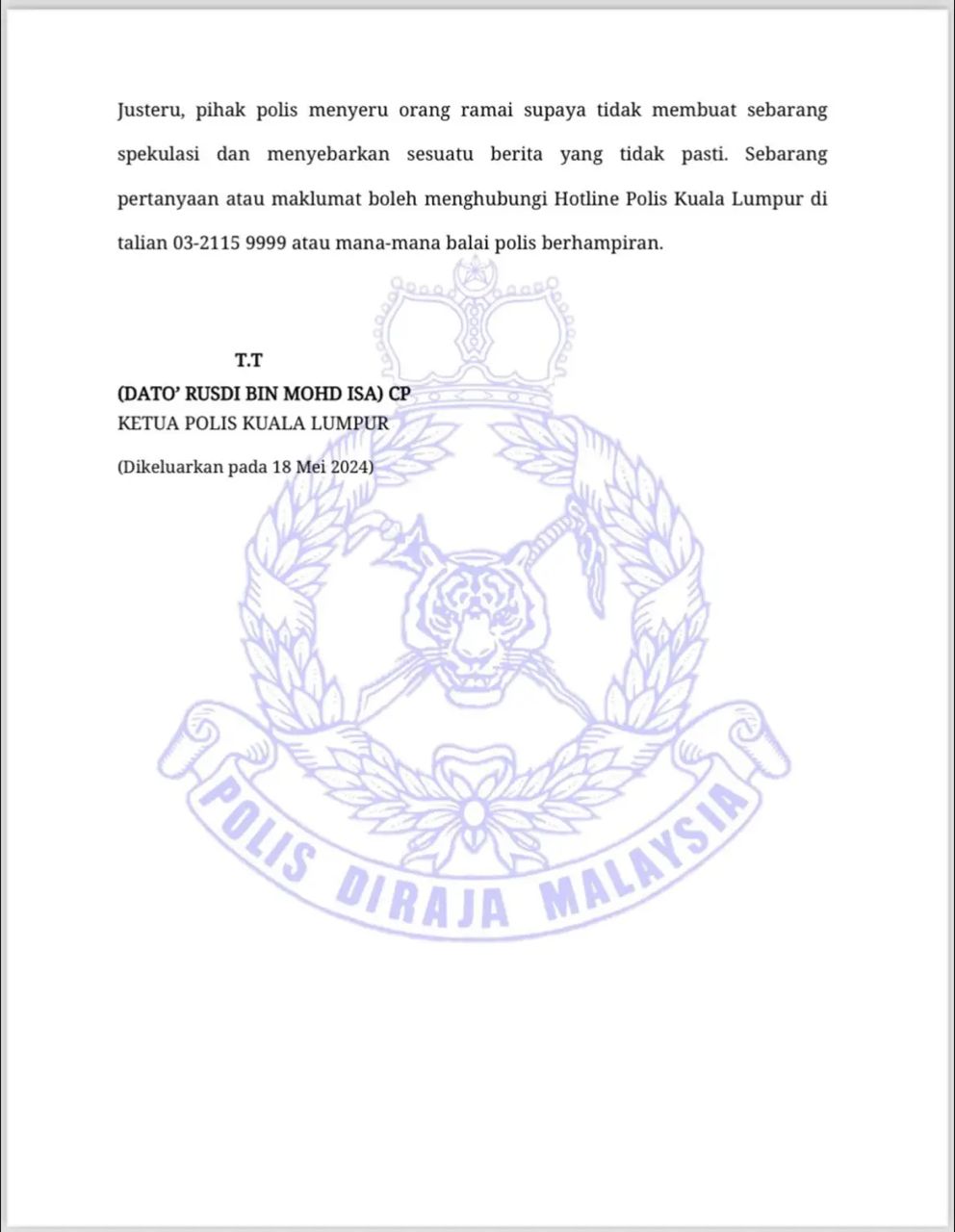 Rusdi berkata, orang ramai diminta supaya tidak membuat sebarang spekulasi dan menyebarkan sesuatu berita yang tidak pasti berkaitan kejadian ini.